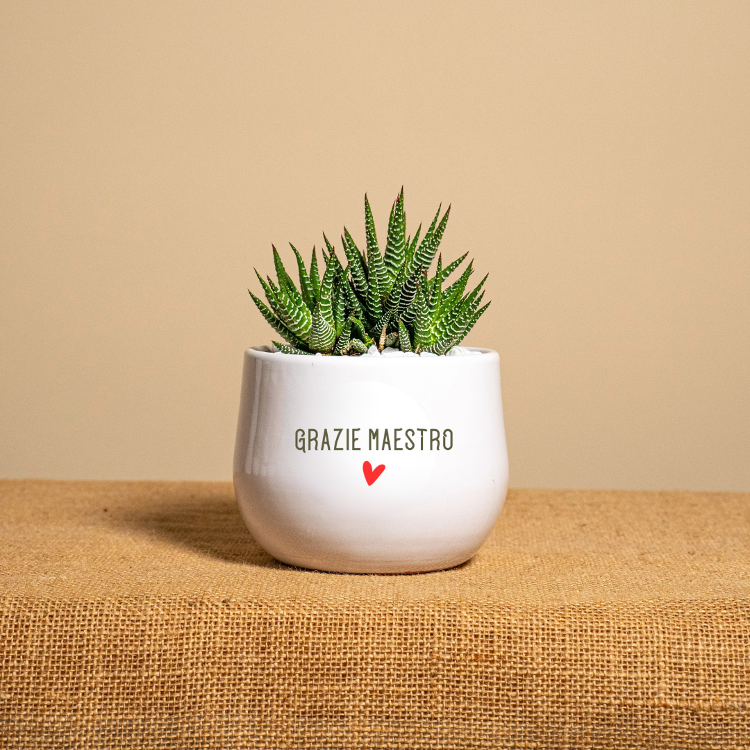 Un pensiero autentico e originale per dire grazie a chi ogni giorno insegna con passione. Il vaso in ceramica, decorato con la dedica “Grazie Maestro”, racchiude una piantina grassa vera, resistente e duratura: un piccolo gesto che lascia un segno speciale nel tempo.