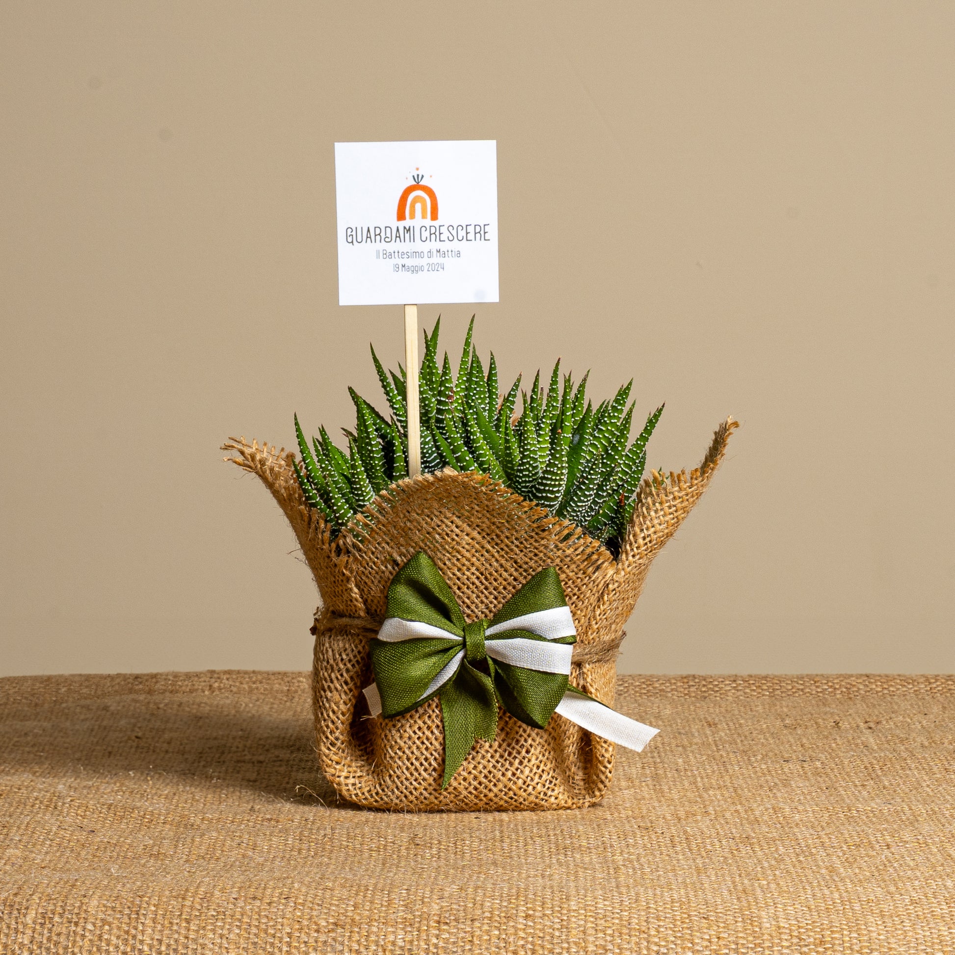 Un tocco di felicità in una piccola piantina grassa! Confezionata con amore nella sua borsa di iuta, pronta a portare sorrisi. Il bigliettino è il tuo spazio creativo!