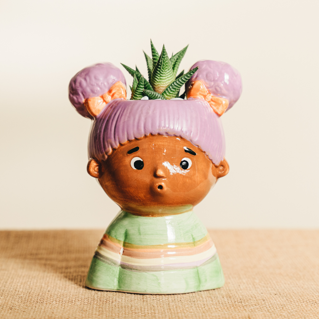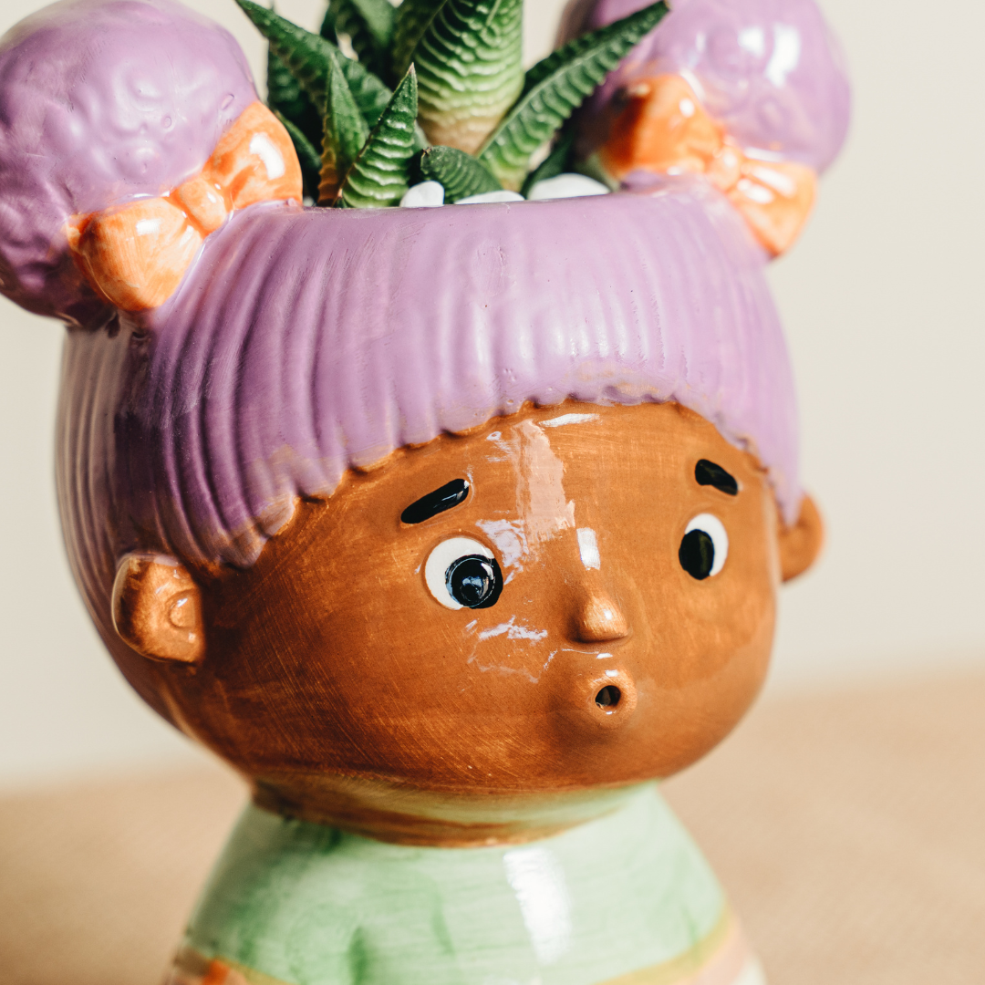 Un vaso in ceramica dal volto dolce e solare, ispirato all’energia e alla bellezza dell’infanzia. I dettagli delicati e l’acconciatura originale lo rendono unico. Perfetto per arredare con allegria o sorprendere con un regalo speciale. Completo di piantina grassa.
